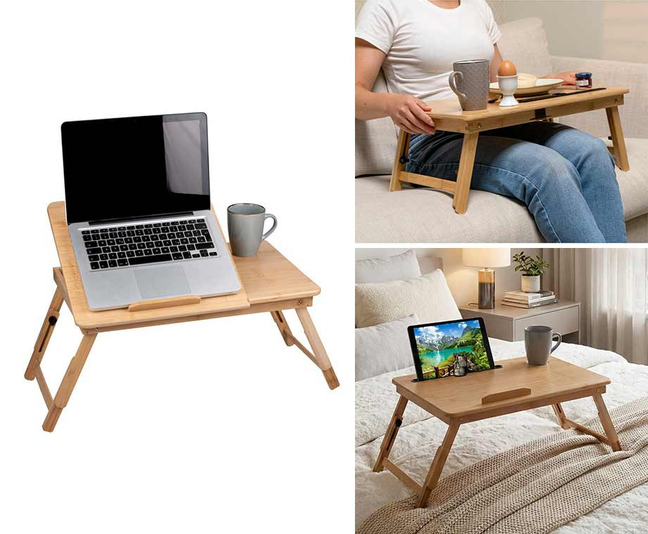 Een handige laptoptafel van hout die werken, streamen en ontspannen comfortabeler en flexibeler maakt, op de bank, in bed of aan het bureau.